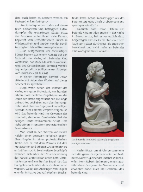 «Und wenn schon der Erbauer der Kirche, ein guter Protestant, vor hundert Jahren zwei liebliche Engelköpfe an der Decke der Kirche angebracht hat, die lange unbeachtet geblieben, nun aber hervorgetreten sind über der Orgel, um ihre heiligen Accorde zum Himmel emporzutragen, so wird das betende Kind im Gewande der Unschuld, das seine Geschwister bei der heiligen Taufe willkommen heisst, uns nicht stören in unserem protestantischen Bewusstsein.»