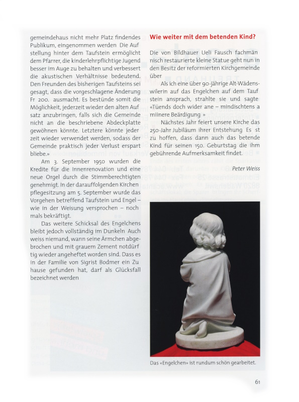 Max Bodmer erklärte, er sei bereit, das Engelchen der Kirchgemeinde zu schenken unter der Bedingung, dass die Ärmchen fachgerecht restauriert und neu befestigt werden und er von der Statue einige Fotos erhalte. Ich versprach ihm, mich dafür einzusetzen, und wir bekräftigten die Abmachung mit Handschlag. «Sie können das Engelchen gleich mitnehmen.»