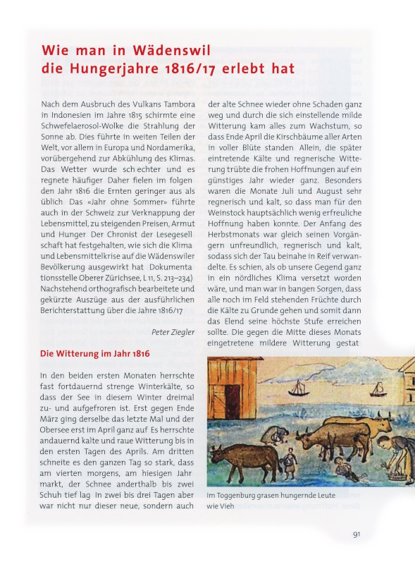 Nach dem Ausbruch des Vulkans Tambora in Indonesien im Jahre 1815 schirmte eine Schwefelaerosol-Wolke die Strahlung der Sonne ab. Dies führte in weiten Teilen der Welt, vor allem in Europa und Nordamerika, vorübergehend zur Abkühlung des Klimas. Das Wetter wurde schlechter und es regnete häufiger. Daher fielen im folgenden Jahr 1816 die Ernten geringer aus als üblich. Das «Jahr ohne Sommer» führte auch in der Schweiz zur Verknappung der Lebensmittel, zu steigenden Preisen, Armut und Hunger. Der Chronist der Lesegesellschaft hat festgehalten, wie sich die Klima- und Lebensmittelkrise auf die Wädenswiler Bevölkerung ausgewirkt hat (Dokumentationsstelle Oberer Zürichsee, L 11, S. 213–234). Nachstehend orthografisch bearbeitete und gekürzte Auszüge aus der ausführlichen Berichterstattung über die Jahre 1816/17.