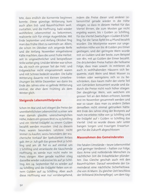 Schon im Mai und Juni stiegen die Preise der unentbehrlichsten Lebensmittel zu einer, wie man damals glaubte, unerschwinglichen Höhe, indem ein grosses Brot zu 23 Schilling und ein Viertel Erdäpfel zu einem Gulden bezahlt werden mussten. Und zu diesem Preis waren besonders Letztere nicht immer zu kaufen, wozu besonders der wucherische Vorkauf der Spekulanten Anlass gab. Am 21. Juli galt das grosse Brot 31 Schilling und am 28. fiel es auf einmal um 7 Schilling und veranlasste die täuschende Hoffnung, es werde nun nicht mehr im Preis steigen. Aber gerade nachher stieg dasselbe wieder sukzessive bis auf 30 Schilling. Am 24. September fiel es wieder auf 24 Schilling und die Erdäpfel fielen von einem Gulden auf 24 Schilling. Aber auch diese Hoffnung war nur vorübergehend, indem die Preise dieser und anderer Lebensmittel gerade wieder in die Höhe stiegen, so dass in diesem Herbst für das Viertel Birnen, die zum Mosten gar nicht ergiebig waren, bis 1 Gulden 20 Schilling, für das Viertel Zwetschgen 1 Gulden 8 Schilling, für die Tanse Äpfel bis 4 Pfund bezahlt wurden. Die Mostpreise waren zur ungewohnten Höhe von bis 18 Gulden pro Eimer gestiegen, und der geringste Wein wurde mit 20 Gulden und der beste, zum Beispiel von 1811, mit 40 Gulden der Eimer bezahlt.