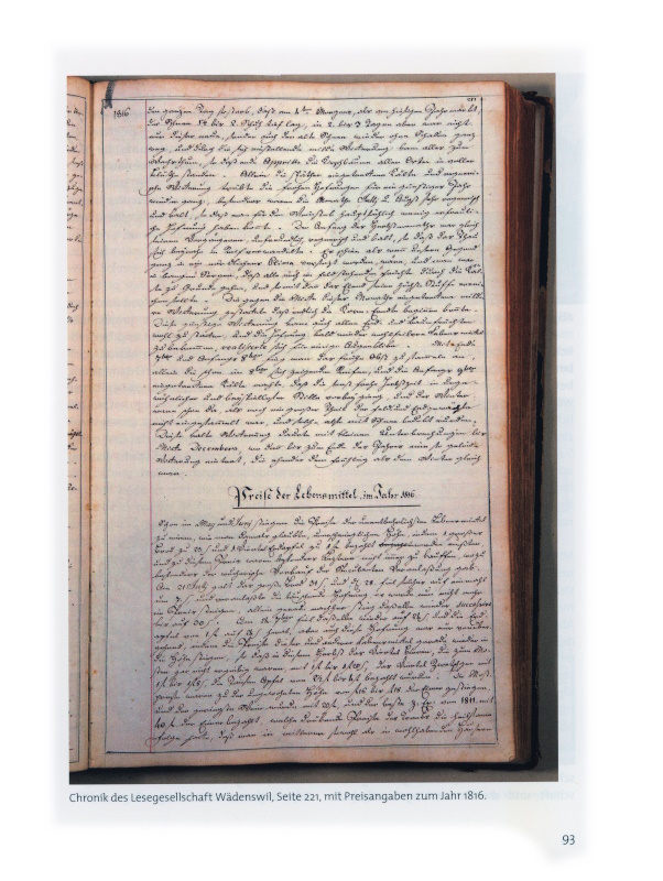 93 Chronik der Lesegesellschaft Wädenswil, Seite 221, mit Preisangaben zum Jahr 1816.