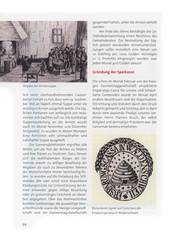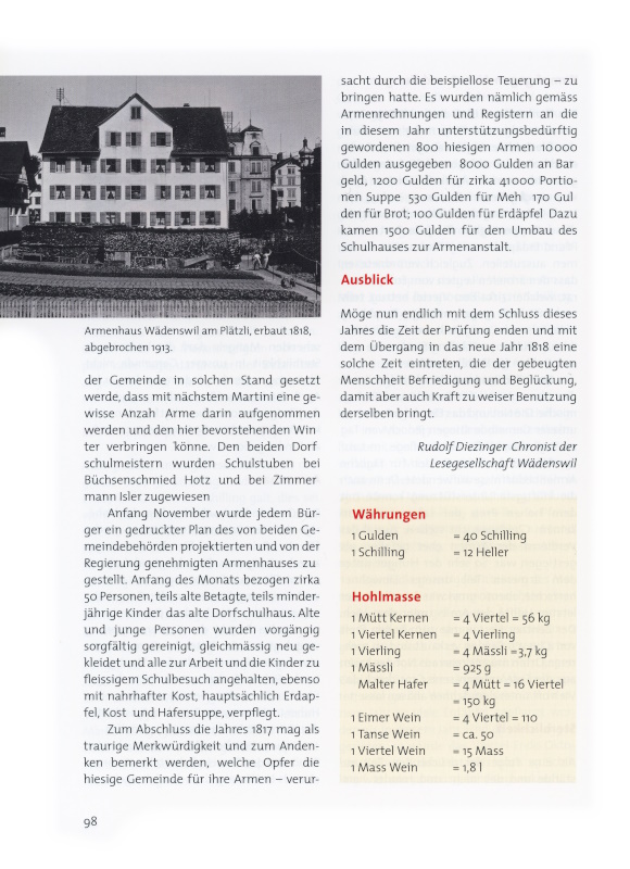 Zum Abschluss die Jahres 1817 mag als traurige Merkwürdigkeit und zum Andenken bemerkt werden, welche Opfer die hiesige Gemeinde für ihre Armen – verursacht durch die beispiellose Teuerung – zu bringen hatte. Es wurden nämlich gemäss Armenrechnungen und Registern an die in diesem Jahr unterstützungsbedürftig gewordenen 800 hiesigen Armen 10‘000 Gulden ausgegeben: 8000 Gulden an Bargeld; 1200 Gulden für zirka 41‘000 Portionen Suppe; 530 Gulden für Mehl; 170 Gulden für Brot; 100 Gulden für Erdäpfel. Dazu kamen 1500 Gulden für den Umbau des Schulhauses zur Armenanstalt.