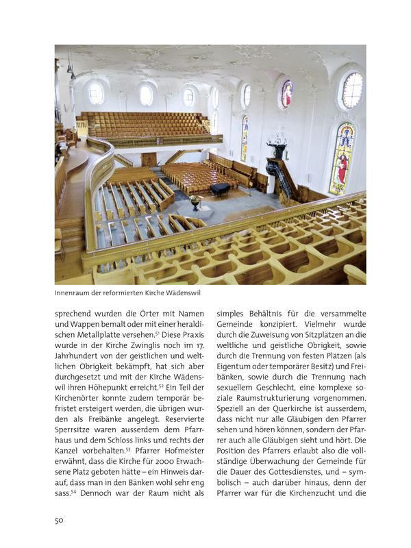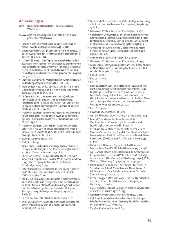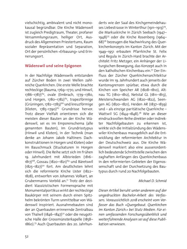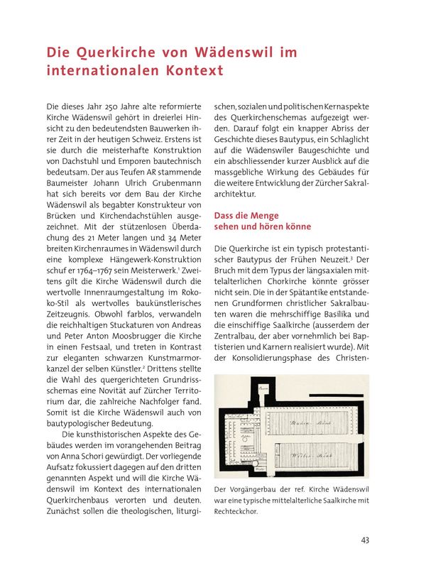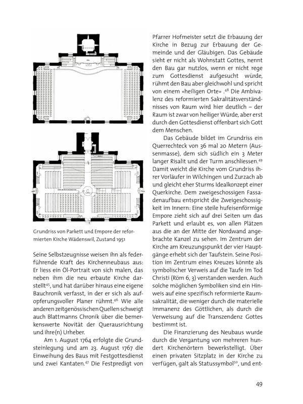 Mit der 1949-1951 erbauten Pfarrkirche St. Felix und Regula in Zürich-Hard brachte der Architekt Fritz Metzger, ein Anhänger der Liturgischen Bewegung, das Konzept auch in den katholischen Kirchenbau ein.77 Der Einfluss der Zürcher Querkirchenarchitektur wurde im 19. Jahrhundert auch jenseits der Kantonsgrenzen spürbar, etwa durch die Kirchen von Speicher AR (1808-1810), Altnau TG (1810–1812), Netstal GL (1811–1813), Meisterschwanden AG (1820–1822), Seengen AG (1820–1821), Heiden AR (1837–1839) und – als einzige paritätischer Querkirche – Wattwil SG (1844-1848).78 Wie an dieser eindrucksvollen Reihe direkter oder indirekter Nachfolgebauten zu erkennen ist, wirkte sich die Initialzündung des Wädenswiler Kirchenbaus massgeblich auf die Entwicklung der reformierten Architektur in der Deutschschweiz aus. Die Kirche Wädenswil markiert also eine ausserordentlich bedeutende Schnittstelle zwischen den zaghaften Anfängen des Querkirchenbaus in den reformierten Gebieten der Eigenossenschaft und der Durchsetzung des Bautypus durch rund 20 Nachfolgebauten.