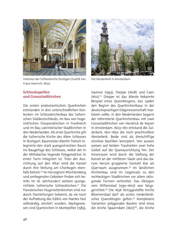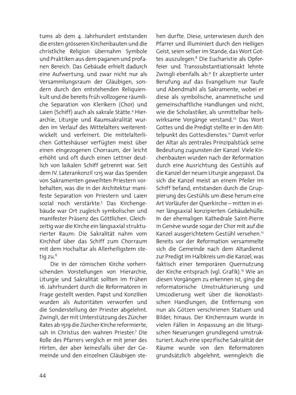 Die in der römischen Kirche vorherrschenden Vorstellungen von Hierarchie, Liturgie und Sakralität sollten im frühen 16. Jahrhundert durch die Reformatoren in Frage gestellt werden. Papst und Konzilien wurden als Autoritäten verworfen und die Sonderstellung der Priester abgelehnt. Zwingli, der mit Unterstützung des Zürcher Rates ab 1519 die Zürcher Kirche reformierte, sah in Christus den wahren Priester.7 Die Rolle des Pfarrers verglich er mit jener des Hirten, der aber keinesfalls über der Gemeinde und den einzelnen Gläubigen stehen durfte. Diese, unterwiesen durch den Pfarrer und illuminiert durch den Heiligen Geist, seien selber im Stande, das Wort Gottes auszulegen.8 Die Eucharistie als Opferfeier und Transsubstantiationsakt lehnte Zwingli ebenfalls ab.9 Er akzeptierte unter Berufung auf das Evangelium nur Taufe und Abendmahl als Sakramente, wobei er diese als symbolische, anamnetische und gemeinschaftliche Handlungen und nicht, wie die Scholastiker, als unmittelbar heilswirksame Vorgänge verstand.10 Das Wort Gottes und die Predigt stellte er in den Mittelpunkt des Gottesdienstes.11 Damit verlor der Altar als zentrales Prinzipalstück seine Bedeutung zugunsten der Kanzel. Viele Kirchenbauten wurden nach der Reformation durch eine Ausrichtung des Gestühls auf die Kanzel der neuen Liturgie angepasst. Da sich die Kanzel meist an einem Pfeiler im Schiff befand, entstanden durch die Gruppierung des Gestühls um diese herum eine Art Vorläufer der Querkirche – mitten in einer längsaxial konzipierten Gebäudehülle. In der ehemaligen Kathedrale Saint-Pierre in Genève wurde sogar der Chor mit auf die Kanzel ausgerichtetem Gestühl versehen.12