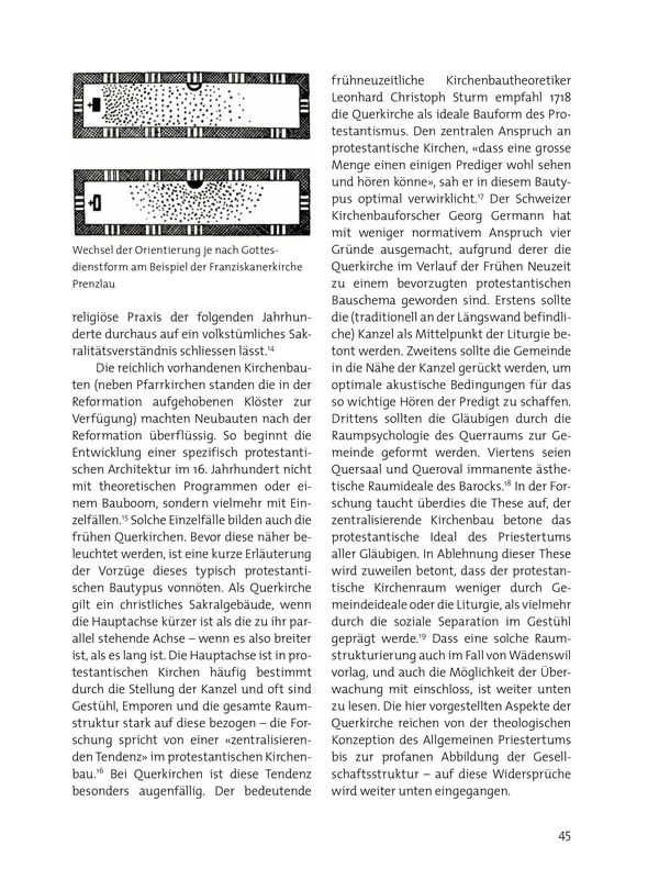 Bereits vor der Reformation versammelte sich die Gemeinde nach dem Altardienst zur Predigt im Halbkreis um die Kanzel, was faktisch einer temporären Quernutzung der Kirche entsprach (vgl. Grafik).13 Wie an diesen Vorgängen zu erkennen ist, geht die reformatorische Umstrukturierung und Umcodierung weit über die ikonoklastischen Handlungen, die Entfernung von nun als Götzen verschrienen Statuen und Bilder, hinaus. Der Kirchenraum wurde in vielen Fällen in Anpassung an die liturgischen Neuerungen grundlegend umstrukturiert. Auch eine spezifische Sakralität der Räume wurde von den Reformatoren grundsätzlich abgelehnt, auch wenn die religiöse Praxis der folgenden Jahrhunderte durchaus auf ein volkstümliches Sakralitätsverständnis schliessen lässt.14