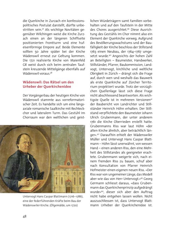 Durch den Sieg der Reformierten im Zweiten Villmergerkrieg 1712 konnte Zürich seinen Einfluss im Flecken verstärken und trug massgeblich zum Kirchenneubau bei.35 Der Architekt Matthias Vogel realisierte hier ein mit Wilchingen im Grundriss nahezu identisches Bauwerk, und hatte einen solchen Querbau möglicherweise bereits für seinen Kirchenbau in Baden 1714 avisiert.36 Dass die Querkirche in Zurzach ein konfessionspolitisches Postulat darstellt, dürfte unbestritten sein.37 Als wichtige Novitäten gegenüber Wilchingen weist die Kirche Zurzach einen an der längeren Schiffseite positionierten Frontturm und eine hufeisenförmige Empore auf. Beide Elemente sollten 50 Jahre später bei der Kirche Wädenswil erneut zur Geltung kommen. Die 1721 realisierte Kirche von Maienfeld GR weist durch sich beim zentralen Taufstein kreuzende Mittelgänge ebenfalls auf Wädenswil voraus.38