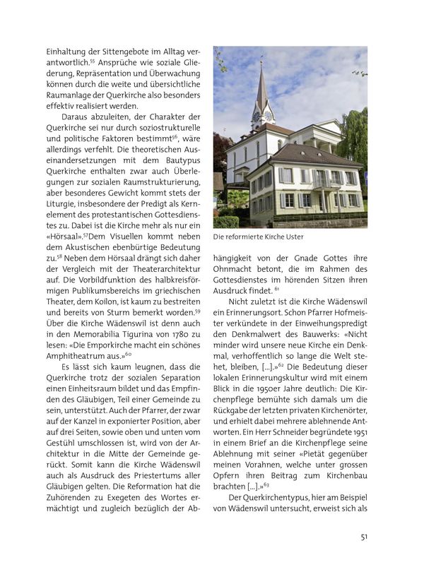Die Reihe setzt sich im frühen 19. Jahrhundert mit Albisrieden (1816-1817)68, Gossau (1820-1821)69 und Bäretswil (1825-1827)70 fort. Am deutlichsten lehnt sich die reformierte Kirche Uster (1822-1828), entworfen von Johannes Volkart, an Grubenmanns Vorbild an.71 Trotz der dezidiert klassizistischen Formensprache mit Monumentalportikus wirkt der rechteckige Baukörper mit seinem durch einen Spitzhelm bekrönten Turm unmittelbar von Wädenswil inspiriert. Ausnahmebauten sind der an Querbauten erinnernde Zentralbau von Thalwil (1846-1847)72 oder die neugotische Halle der Grossmünsterkapelle (1858-1860).73 Auch Querbauten des 20. Jahrhunderts wie der Saal des Kirchgemeindehauses Liebestrasse in Winterthur (1911-1913)74, die Markuskirche in Zürich Seebach (1947-1948)75 oder die Kirche Rosenberg (1964-68)76 bezeugen die Nachwirkung des Querkirchenkonzepts im Kanton Zürich.