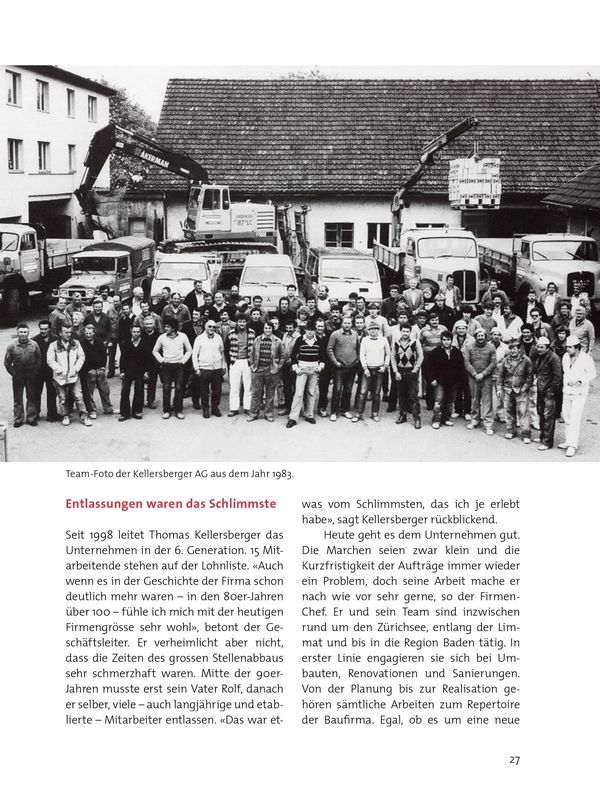 Heute geht es dem Unternehmen gut. Die Marchen seien zwar klein und die Kurzfristigkeit der Aufträge immer wieder ein Problem, doch seine Arbeit mache er nach wie vor sehr gerne, so der Firmen-Chef. Er und sein Team sind inzwischen rund um den Zürichsee, entlang der Limmat und bis in die Region Baden tätig. In erster Linie engagieren sie sich bei Umbauten, Renovationen und Sanierungen. Von der Planung bis zur Realisation gehören sämtliche Arbeiten zum Repertoire der Baufirma. Egal, ob es um eine neue Küche, ein neues Bad, die Vergrösserung eines Wohnzimmers oder aber um eine Total- oder Teilsanierung eines Hauses geht – die Kellersberger AG ist zur Stelle. Auch Kleinstaufträge wie die Betonsanierung eines Balkons bei rostenden Armierungseisen nimmt sie gerne entgegen.
