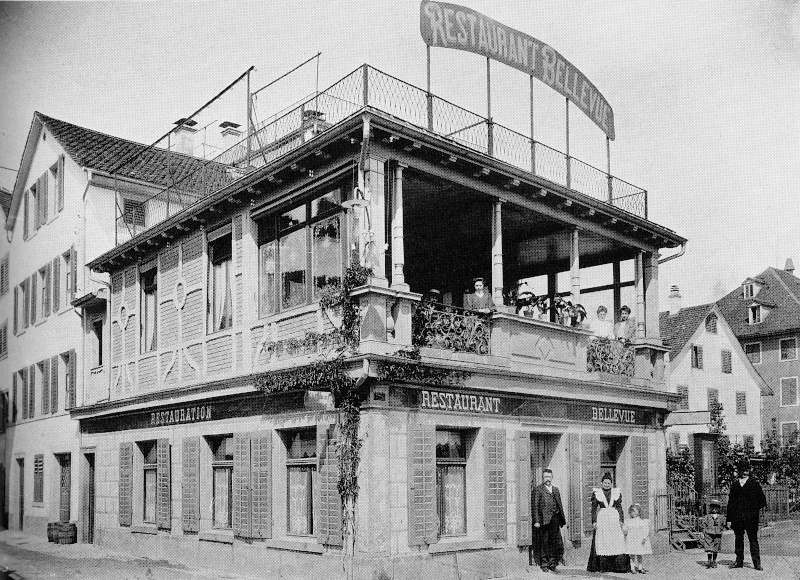 Das 1931 abgebrochene Restaurant Bellevue an der Ecke Kronengasse (links)/Bahnhofstrasse (vorn). Die Terrasse ragte einst weiter gegen den See vor und wurde beim Bau der Eisenbahnlinie in den 1870er Jahren verkürzt. Rechts das Haus Bahnhofstrasse 11 und Hotel Engel. [pzi]