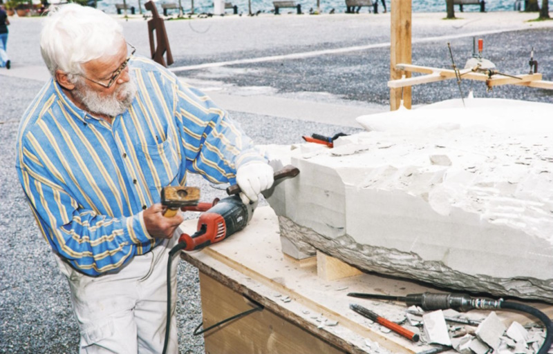 Um der Bevölkerung Einblick in das Schaffen eines Bildhauers zu geben, installierte Urs Burkhardt im September 1990 auf dem Seeplatz eine Werkhütte und machte sich dann in aller Öffentlichkeit ans Werk. Er wollte der Bevölkerung zeigen, wie und was ein zeitgenössischer Bildhauer schaffte – und er hatte damit Erfolg. Das Interesse war gross und täglich verfolgten viele Interessierte das Vorankommen des Kunstwerkes.