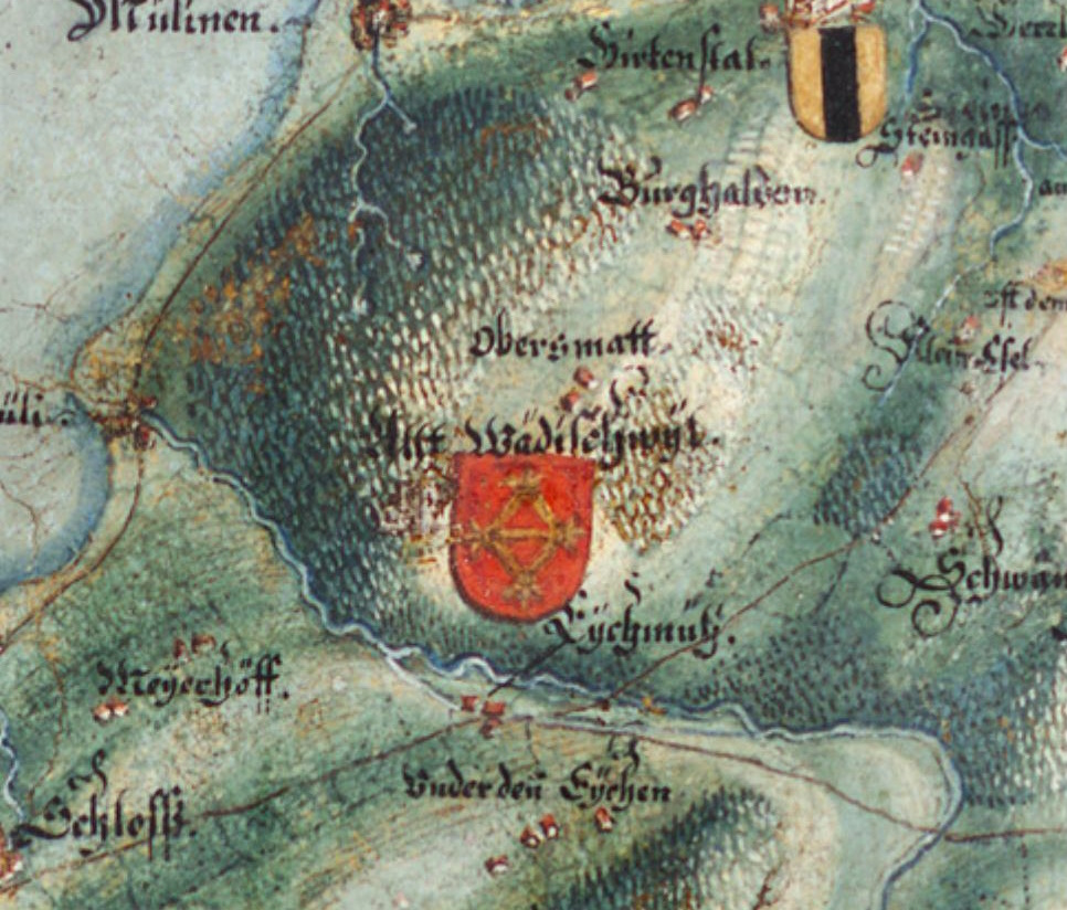 Der ursprüngliche Name für den Standort der späteren Eichmüli lautet also Lutringen. Er wird erstmals 1266 erwähnt und ist zu deuten als: bei den Leuten des Luter.5 Der Hof auf noch stark bewaldeter Terrasse war Eigentum der Freiherren von Wädenswil, die im gegenüberliegenden, durch das Tobel des Reidbachs getrennten Burgturm hausten. Als der Edle Rudolf von Wädenswil Ende August 1270 Güter in Hütten, Langmoos und die Schweigen beidseits der Sihl an das Kloster Wettingen verkaufte, übertrug er seiner Frau Anna von Bürglen zur Absicherung der Morgengabe den Hof Lutringen sowie 22 Jucharten Reben im Letten zu Wädenswil.6