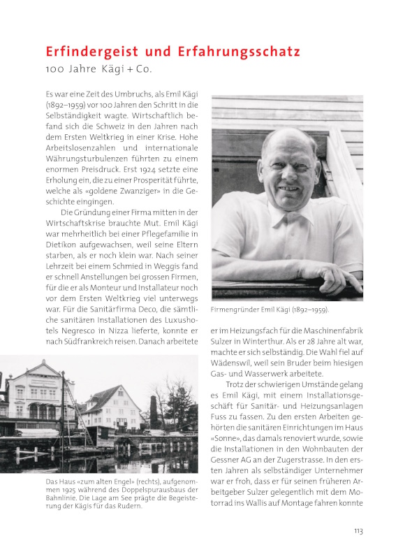 Die Gründung einer Firma mitten in der Wirtschaftskrise brauchte Mut. Emil Kägi war mehrheitlich bei einer Pflegefamilie in Dietikon aufgewachsen, weil seine Eltern starben, als er noch klein war. Nach seiner Lehrzeit bei einem Schmied in Weggis fand er schnell Anstellungen bei grossen Firmen, für die er als Monteur und Installateur noch vor dem Ersten Weltkrieg viel unterwegs war. Für die Sanitärfirma Deco, die sämtliche sanitären Installationen des Luxushotels Negresco in Nizza lieferte, konnte er nach Südfrankreich reisen. Danach arbeitete er im Heizungsfach für die Maschinenfabrik Sulzer in Winterthur. Als er 28 Jahre alt war, machte er sich selbständig. Die Wahl fiel auf Wädenswil, weil sein Bruder beim hiesigen Gas- und Wasserwerk arbeitete.