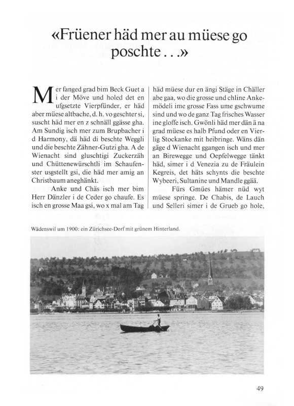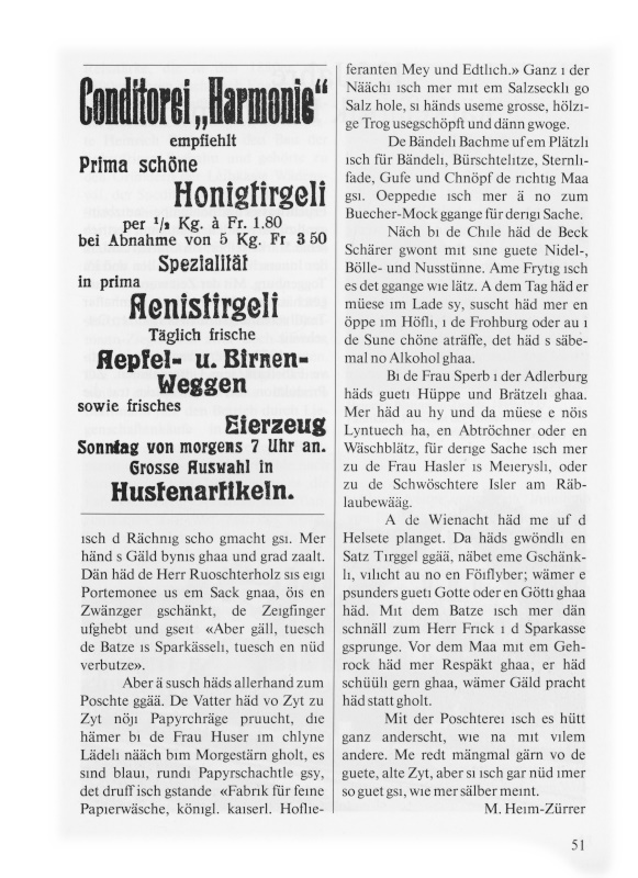 Mer fanged grad bim Beck Guet aa i der Möve und holed deet en uufgsetzte Vierpfünder, er häd aber müese altbache, vo geschter sii, suscht häd mer en z schnäll ggässe ghaa. Am Sundig isch mer zum Brupbacher i d Harmonii, dä häd di beschte Weggli und die beschte Zääner-Gutzi ghaa. Ade Wienacht sind gluschtigi Zuckerzäh und Chüttenewürschtli im Schaufenster uusgstellt gsii, die häd mer amig an Christbaum aneghänkt.