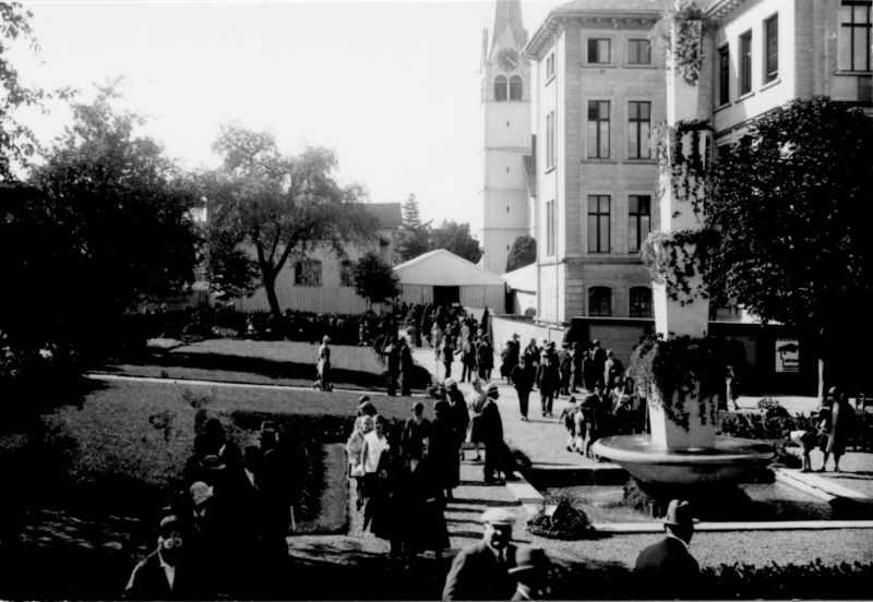 Gasiplatz aus betrat, wo man einmalig den Eintritt von Fr. 1.50 zu bezahlen hatte. Auf dem Platz gelangte man zur Festhalle, in der verschiedene musikalische Anlässe stattfanden, zur Weinstube und den Toiletten. Nach dem Treppenaufstieg stand man vor der Anlage mit einem grossen Brunnen. Bergseits des Schulhauses