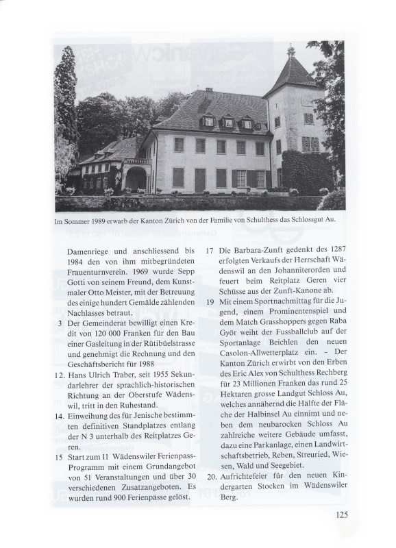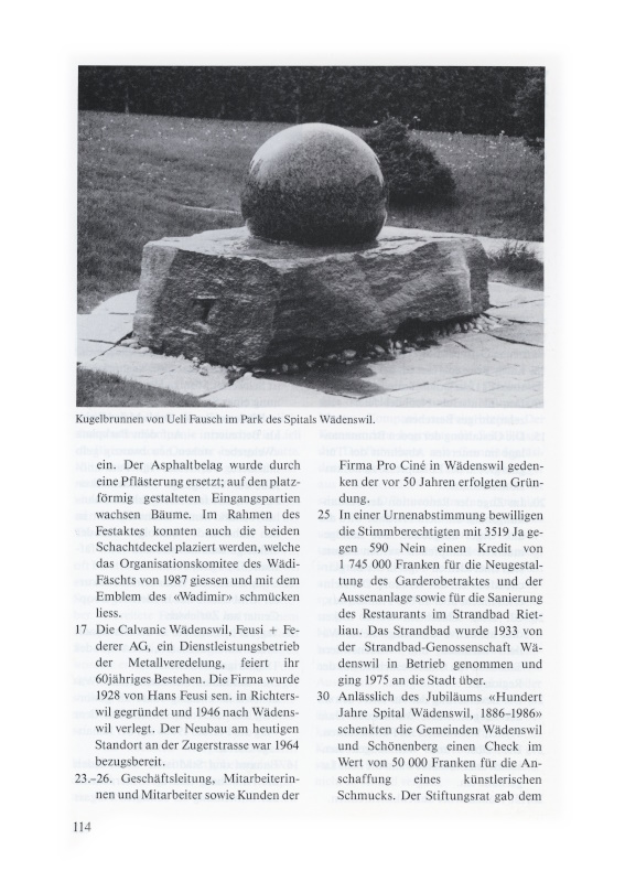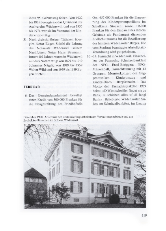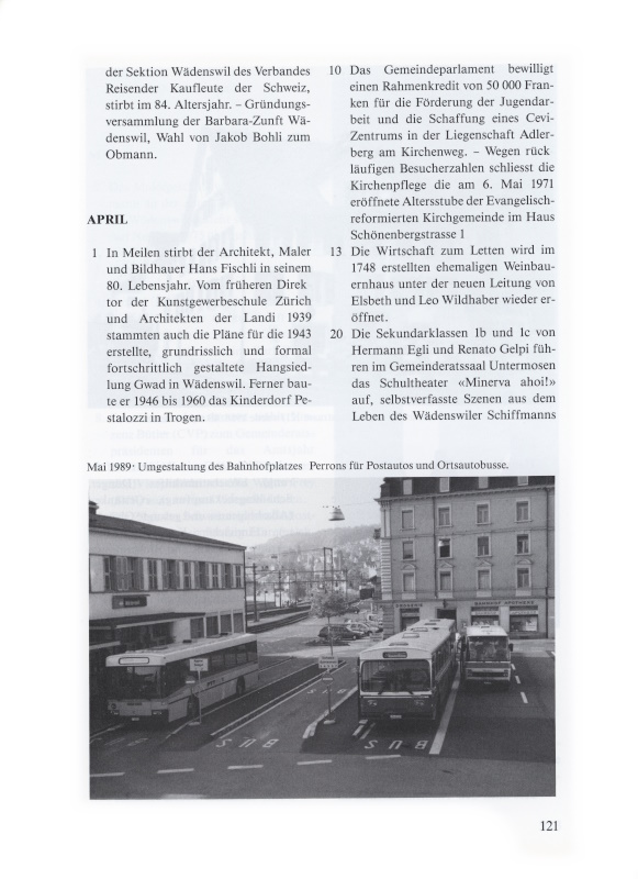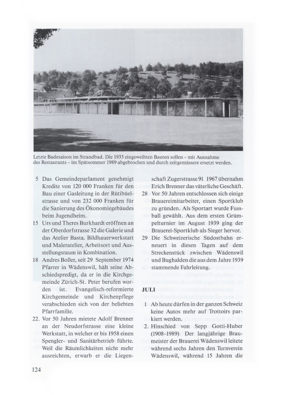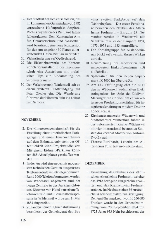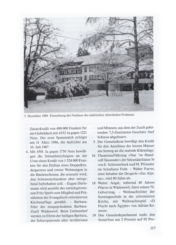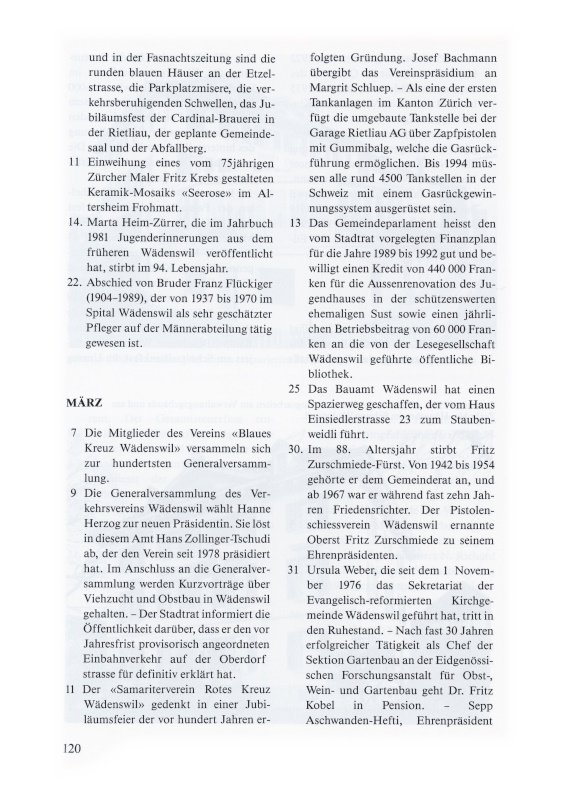 Geschäftshauses Dosenbach. − Eröffnung einer von Stefan Paradowsky (Lachen) und Erika Berghoff (Wädenswil) gestalteten neuen Ausstellung in der Ingenieurschule. Gezeigt werden 60 Plakate zum Thema Obst-, Wein- und Gartenbau, gegliedert nach den Themenkreisen «Auftakt» (Von der Gesundheit zur Verführung), «Wachstumshilfe» (Dünger, Schädlingsbekämpfung), «Getränke» (Alkoholgenuss und gesunde Obstsäfte), «Einmachen, Konserven, Kühlschränke», «Wein- und Blumenfeste» sowie «Auswüchse» (Alkoholkonsum und Umweltzerstörung).
