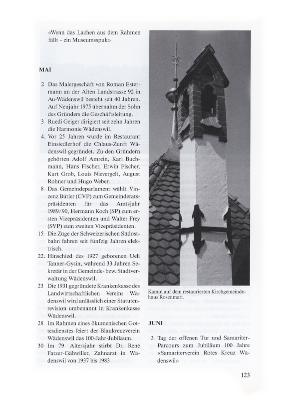 29. «D Chilemüüs», eine Spielgemeinschaft aus Mitgliedern der Jungen Kirche Wädenswil, führen mit grossem Erfolg das neuste von Pfarrer Andres Boller verfasste Cabaretstück auf: «Wenn das Lachen aus dem Rahmen fällt − ein Museumsspuk».