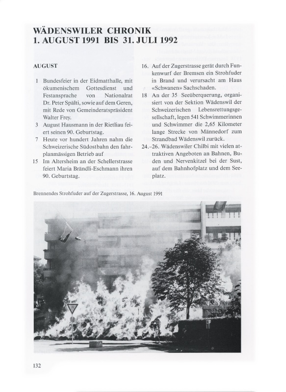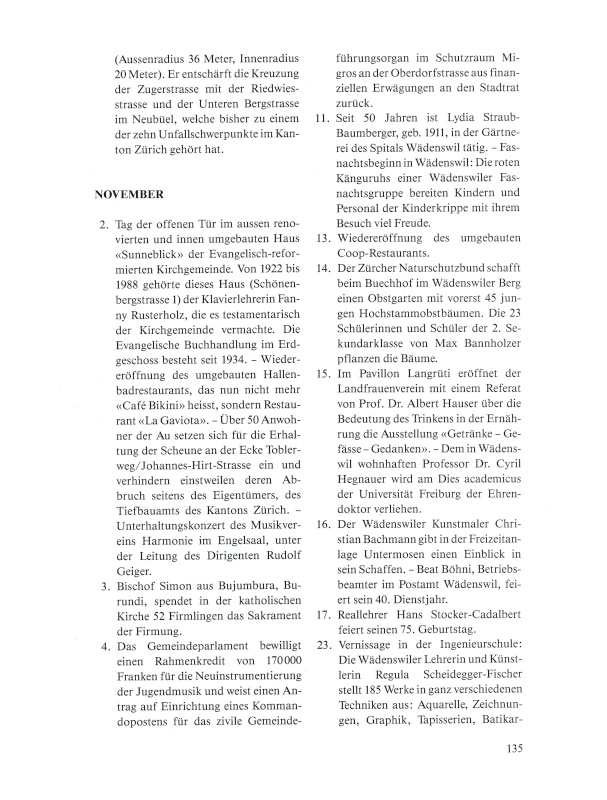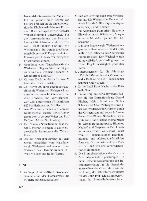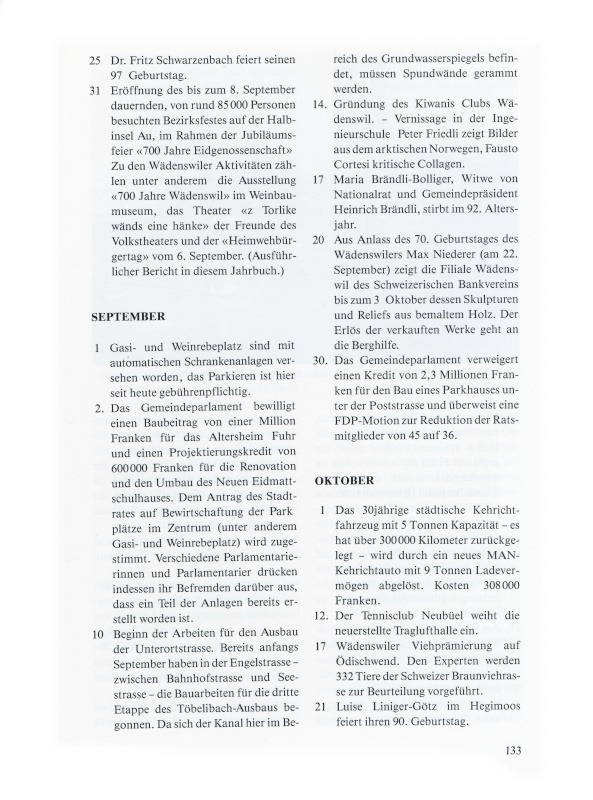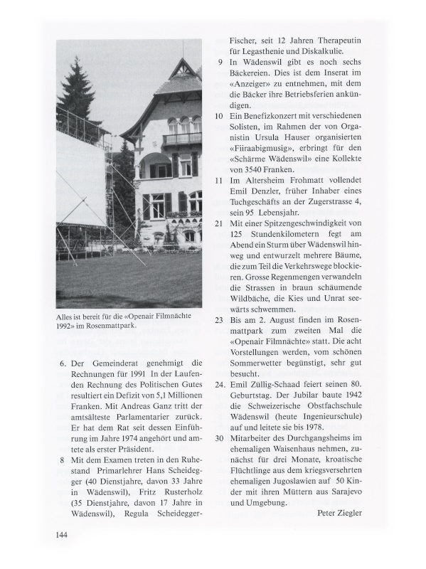 Tuwag-Immobilien-AG in der Industriezone Einsiedlerstrasse 32 (Einbau eines Kindergartens) sowie die Abfallverordnung mit Einführung der Kehrichtsackgebühr. Die Kreditvorlagen betreffend Einrichtung von Sammelstellen und eines zentralen Sammelplatzes für Altmaterial sowie für den Bau einer Kompostieranlage im Grossholz werden an den Stadtrat zurückgewiesen. − Alice Bossard-Blattmann, aufgewachsen an der Florhofstrasse 18, feiert ihren 90. Geburtstag.