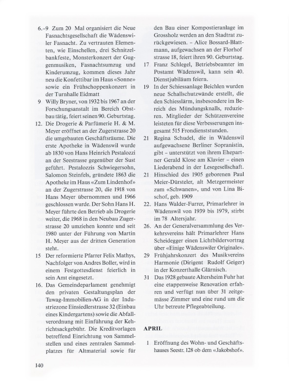 12. Die Drogerie & Parfümerie H. & M. Meyer eröffnet an der Zugerstrasse 20 die umgebauten Geschäftsräume. Die erste Apotheke in Wädenswil wurde ab 1830 von Hans Heinrich Pestalozzi an der Seestrasse gegenüber der Sust geführt. Pestalozzis Schwiegersohn, Salomon Steinfels, gründete 1863 die Apotheke im Haus «Zum Lindenhof» an der Zugerstrasse 20, die 1918 von Hans Meyer übernommen und 1966 geschlossen wurde. Der Sohn Hans H. Meyer führte den Betrieb als Drogerie weiter, die 1968 in den Neubau Zugerstrasse 20 umziehen konnte und seit 1980 unter der Führung von Martin H. Meyer aus der dritten Generation steht.