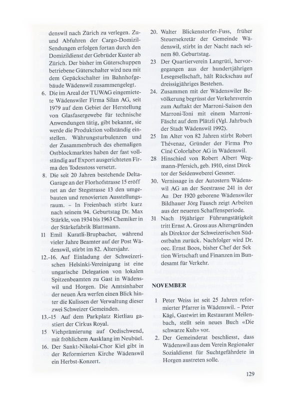 6. Die im Areal der TUWAG eingemietete Wädenswiler Firma Silan AG, seit 1979 auf dem Gebiet der Herstellung von Glasfasergewebe für technische Anwendungen tätig, gibt bekannt, sie werde die Produktion vollständig einstellen. Währungsturbulenzen und der Zusammenbruch des ehemaligen Ostblockmarktes haben der fast vollständig auf Export ausgerichteten Firma den Todesstoss versetzt.