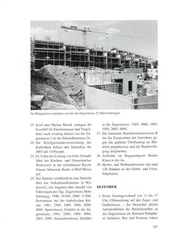 Ursula Hauser geben in der reformierten Kirche ein weihnachtliches Chor- und Orgelkonzert. – Die kantonale Baudirektion bewilligt zur besseren Erschliessung des Gewerbegebiets Hintere Rüti den Bau eines dritten Kreisels in der Zugerstrasse.