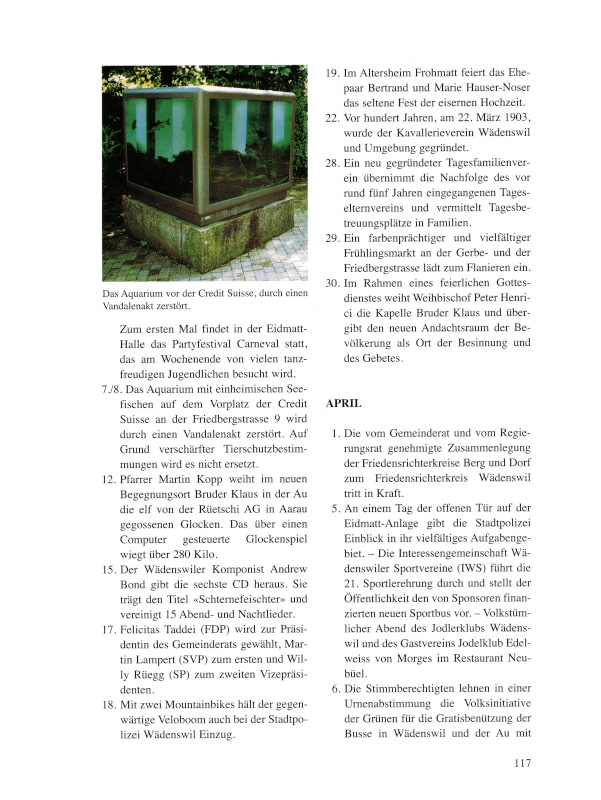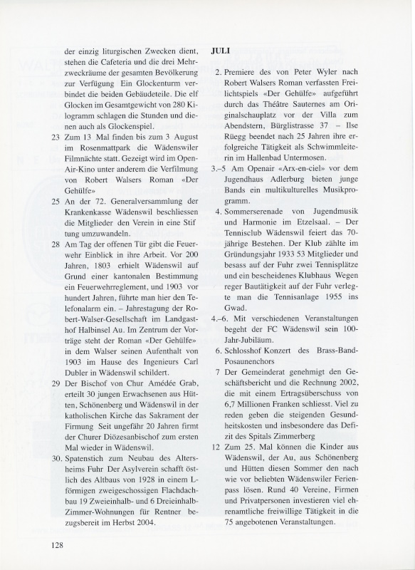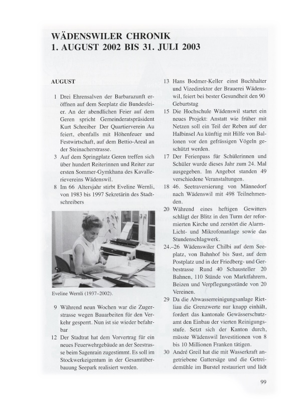 8. Die Versammlung der Evangelisch-reformierten Kirchgemeinde genehmigt das Budget 2003 und belässt den Steuerfuss bei 12 Prozent. – Am 29. Kaltwasserschwimmen im