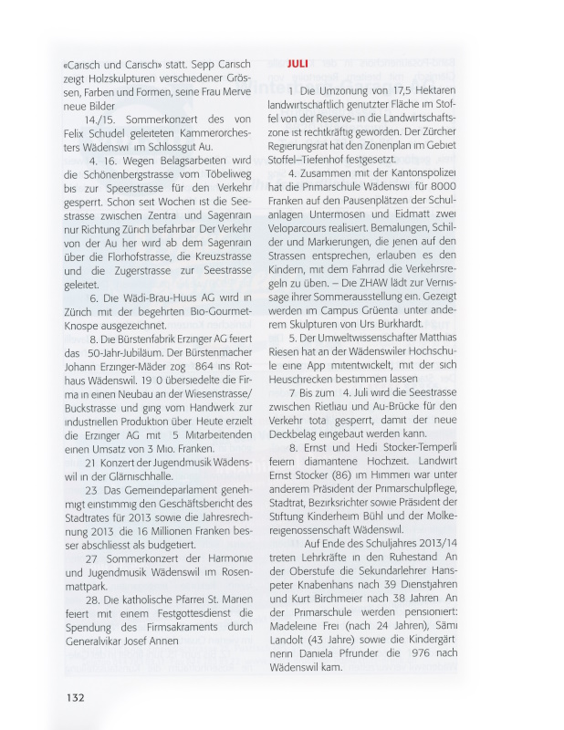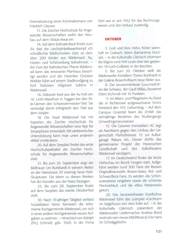 5. Der Stadtrat Wädenswil hat definitiv entschieden: Er will im Rüti Hof Land kaufen, damit dort der Gewerbepark «Werkstatt Zürichsee» entstehen kann. Bereits haben 27 Firmen ihr Interesse an einer Parzelle bekundet. Nun muss der Gemeinderat über den Kredit von 22,85 Millionen Franken entscheiden. – Elf Personen bewerben sich um einen der sieben Sitze im Wädenswiler Stadtrat. An einem Wahlpodium in der Kulturhalle Glärnisch stellen sich die Kandierenden dem Publikum vor.