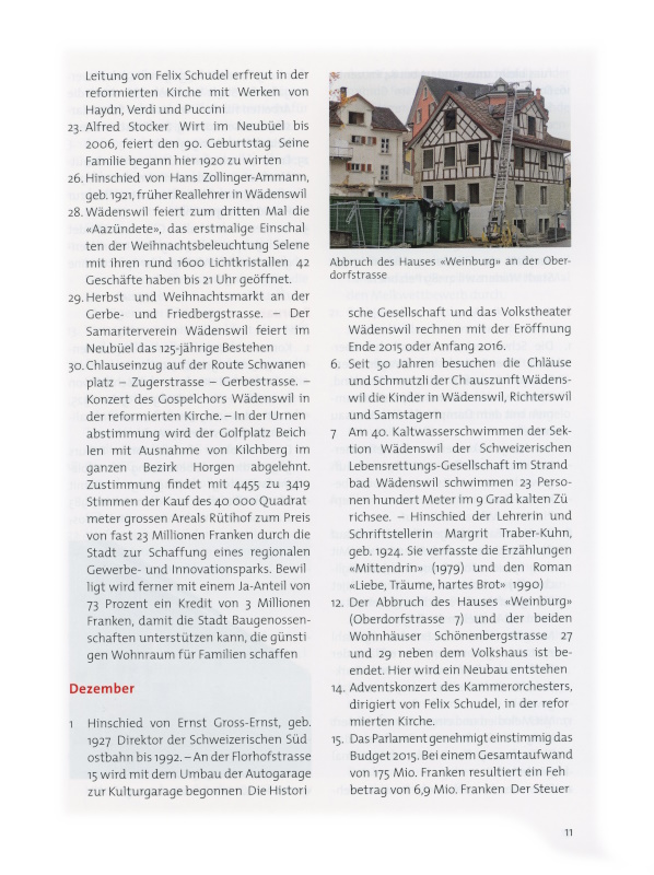 7. Wegen eines heftigen Gewitterregens kann die Kanalisation auf der Zugerstrase und der Schönenbergstrasse das Wasser nicht mehr schlucken. Weil der Schwemmrechen verstopft ist, tritt der Töbelibach über die Ufer. Zwischen 22 Uhr und 2 Uhr muss die Feuerwehr elfmal ausrücken und u.a. an der Engelstrasse 1 Wasser und Schlamm aus einem Coiffeurgeschäft pumpen.
