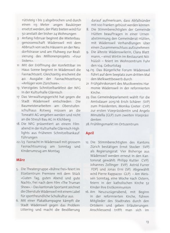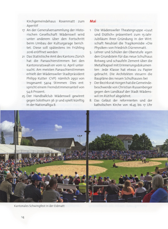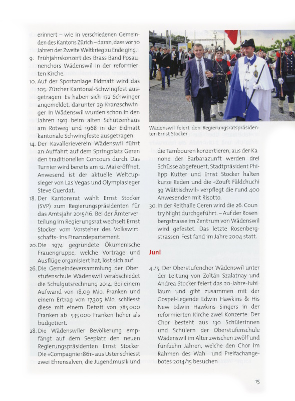 4./5. Der Oberstufenchor Wädenswil unter der Leitung von Zoltán Szalatnay und Andrea Stocker feiert das 20-Jahre-Jubiläum und gibt zusammen mit der Gospel-Legende Edwin Hawkins & His New Edwin Hawkins Singers in der reformierten Kirche zwei Konzerte. Der Chor besteht aus 130 Schülerinnen und Schülern der Oberstufenschule Wädenswil im Alter zwischen zwölf und fünfzehn Jahren, welche den Chor im Rahmen des Wahl- und Freifachangebotes 2014/15 besuchen.