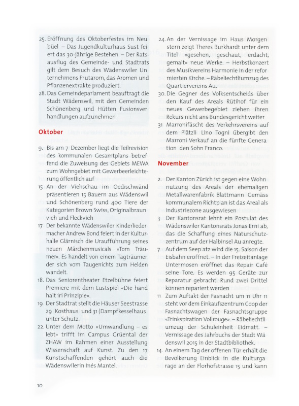 31. Als letzte der 12 Bezirksgemeinden stimmt das Gemeindeparlament dem neuen Zweckverband Zivilschutz Zimmerberg zu, einer Fusion, die am 1. Januar 2016 unter dem Präsidium von Walter Tessarolo (Hütten) in Kraft tritt.