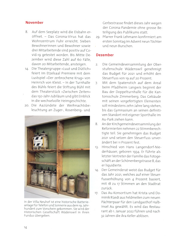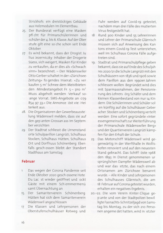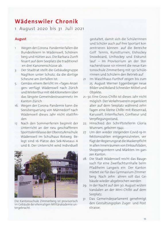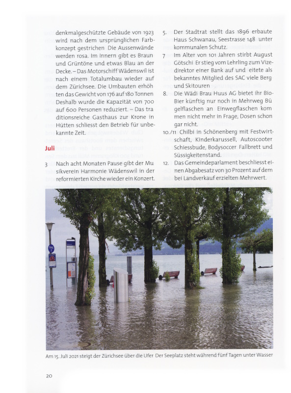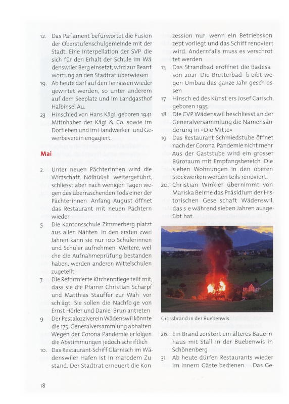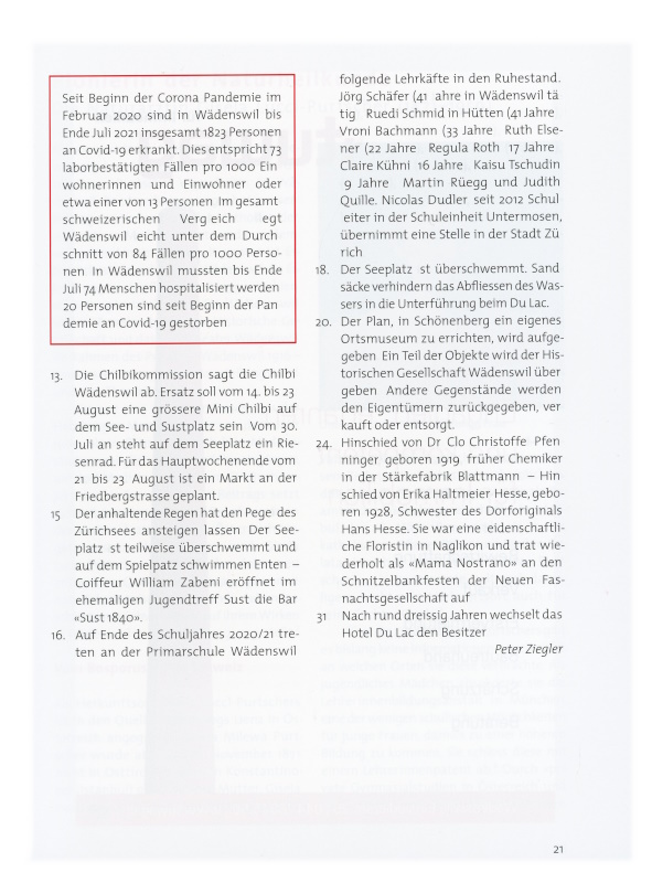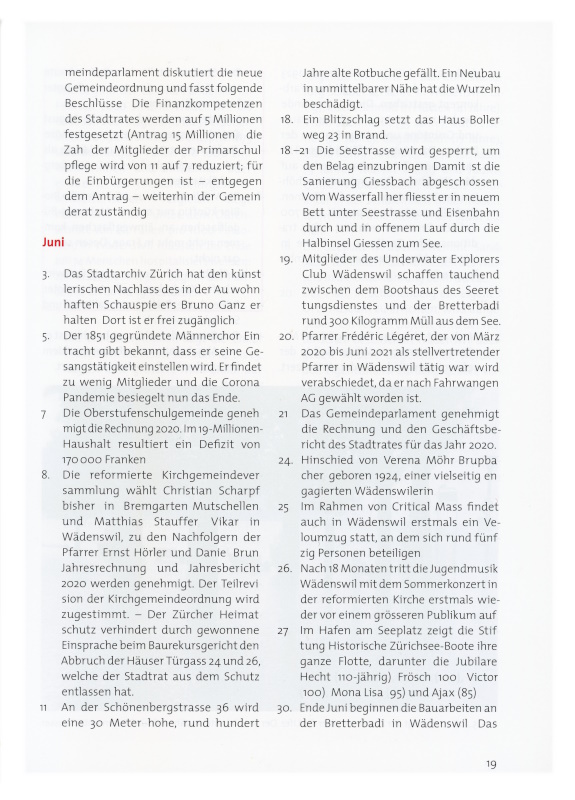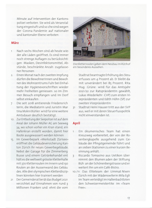 8. Die Kirchgemeindeversammlung wählt Christian Scharpf, bisher in Bremgarten-Mutschellen, und Matthias Stauffer, Vikar in Wädenswil, zu den Nachfolgern der Pfarrer Ernst Hörler und Daniel Brun. Jahresrechnung und Jahresbericht 2020 werden genehmigt. Der Teilrevision der Kirchgemeindeordnung wird zugestimmt. – Der Zürcher Heimatschutz verhindert durch gewonnene Einsprache beim Baurekursgericht den Abbruch der Häuser Türgass 24 und 26, welche der Stadtrat aus dem Schutz entlassen hat.