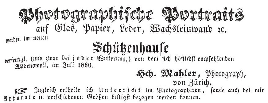 120a Der umherreisende Fotograf Mahler gastierte 1860 im Schützenhaus und warb im «Allgemeinen Anzeiger vom Zürichsee».