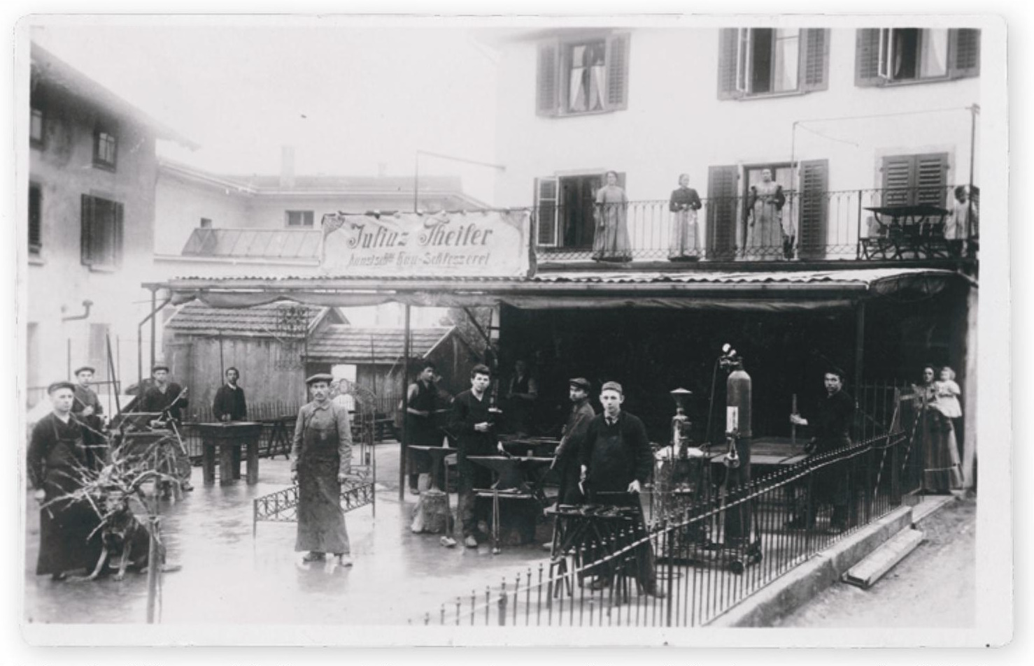 122b Arbeiter der Schlosserei Theiler sowie Bewohnerinnen und Angestellte des angrenzenden Wohnhauses, 1912, aufgenommen von Emil Listenow.