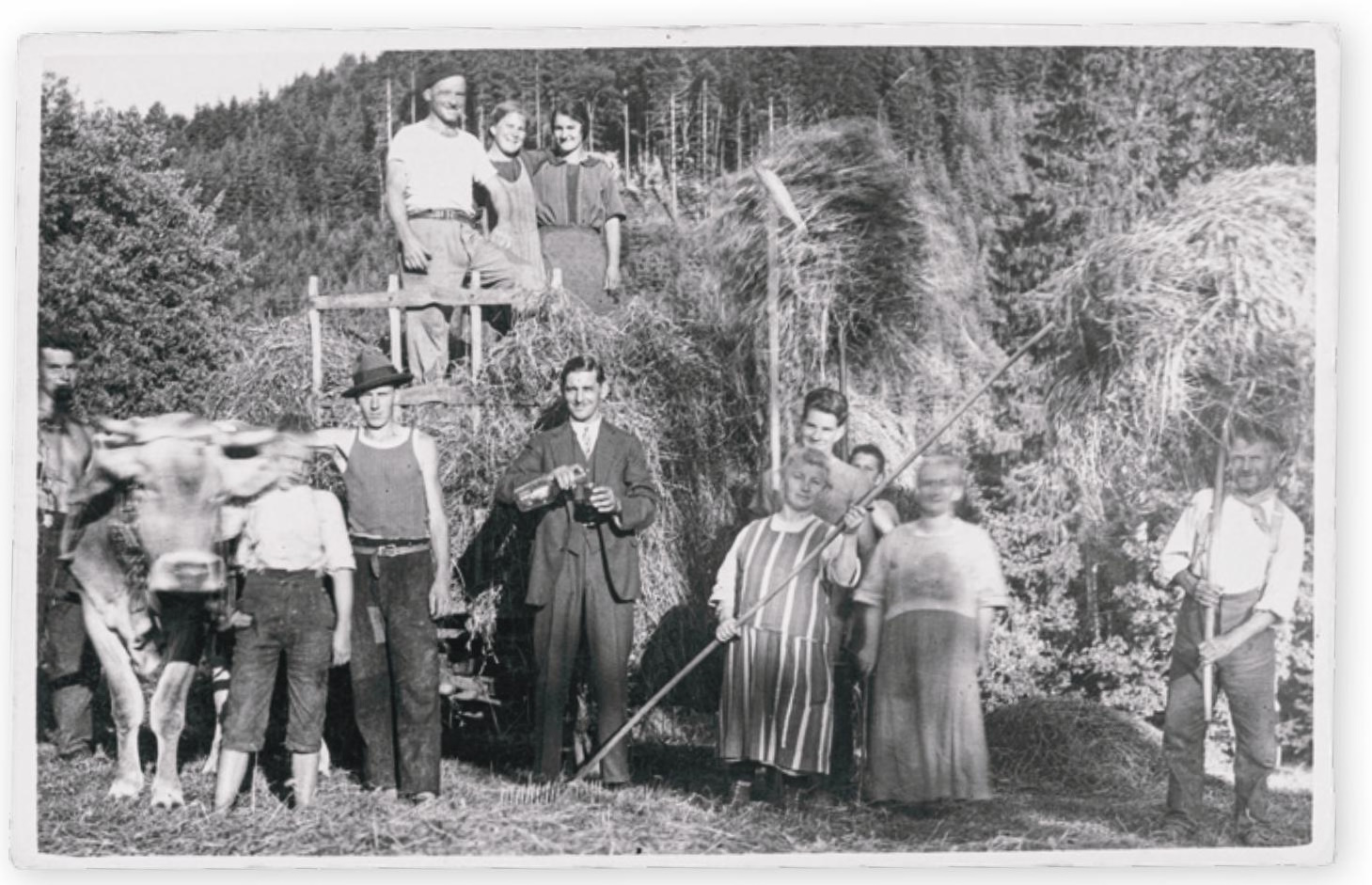 123a Heuernte in Hütten in den 1940er-Jahren. Die Belichtungszeit des Bildes war zu lange, als dass die Kinder und die Kühe lange genug hätten stillhalten können.