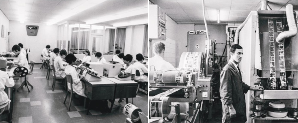 Anfang der 1950er-Jahre musste sich die Firma «Pro Ciné» jedoch neu orientieren – ein Grund dafür war, dass das Schweizer Fernsehen eigene Labors eingerichtet hatte. Die «Pro Ciné» spezialisierte sich in der Folge auf die Verarbeitung von Farbfilmen. Insbesondere mit dem neuen Kodachrome-II-Farbfilm gewann die Farbfotografie ab 1961 schnell an Beliebtheit, doch ihre Verarbeitung war für die Fotogeschäfte zu komplex. Die belichteten Filme mussten an die Firma Kodak in den USA zur Verarbeitung geschickt werden, was einige Wochen in Anspruch nehmen konnte. Die «Pro Ciné» konnte eine schnellere Alternative dazu bieten, indem sie die Filme direkt in Wädenswil entwickelte und Abzüge herstellte.24 Diese Neuausrichtung führte schliesslich zum neuen Firmennamen «Pro Ciné Colorlabor» und zum Umzug an die Holzmoosrütistrasse im Jahr 1971. Farbfilme, die Amateurfotografinnen und -fotografen in der ganzen Schweiz zu ihren lokalen Fotogeschäften gebracht hatten, wurden in den Wädenswiler Labors verarbeitet. Mit diesem Geschäftsmodell wuchs das «Pro Ciné Colorlabor» zum grössten Fotolabor der Schweiz heran: Über 400 Mitarbeitende arbeiteten Ende der 1980er-Jahre für die Pro Ciné, die ab 1974 von René Thévenaz, dem Sohn des Gründers, geführt wurde.25