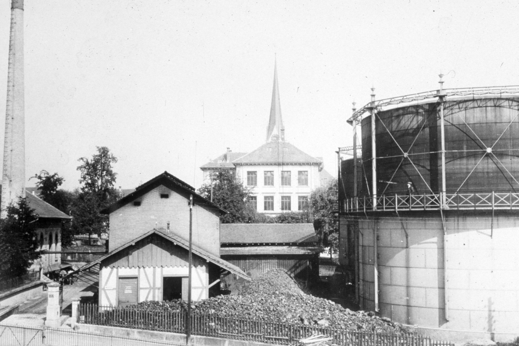 18 Gaswerk Wädenswil, eingeweiht 1874, abgebrochen 1926. Blick von der Eintrachtstrasse gegen das Neue Eidmattschulhaus.