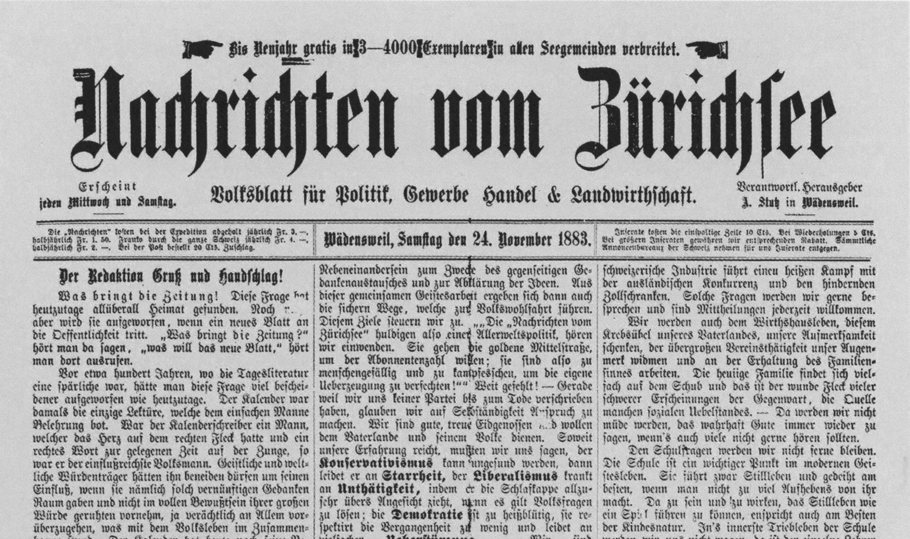 Adolf Stutz-Spühler eröffnet an der Zugerstrasse eine Druckerei und gibt am 24. November die erste Nummer der zweimal wöchentlich erscheinenden «Nachrichten vom Zürichsee» heraus.