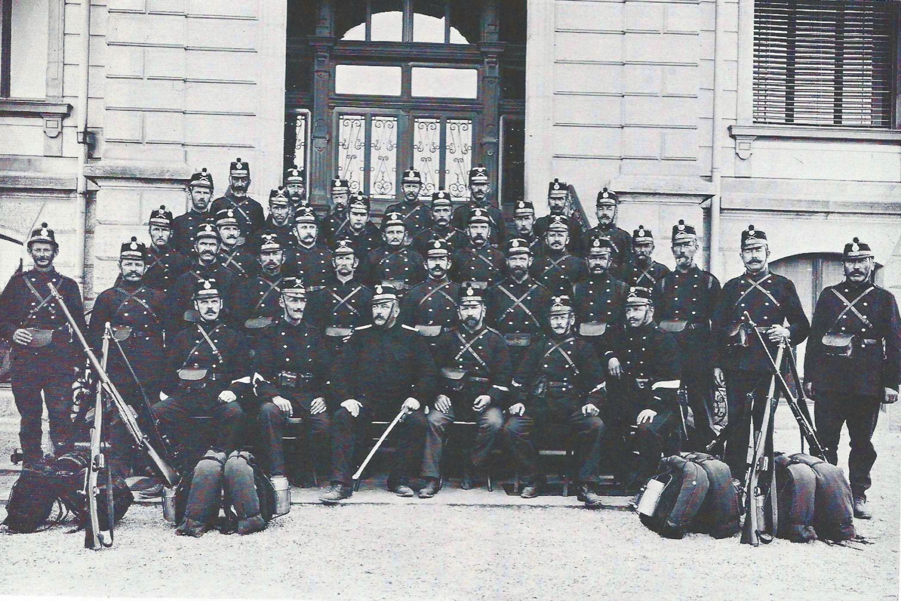 36 Kriegsmobilmachung 1914. Die 3. Kompanie des Landsturmbatallions 60 vor dem Neuen Eidmattschulhaus.