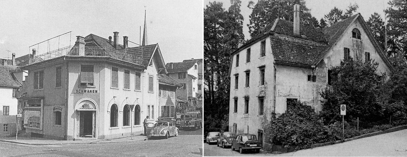 63 Gasthof «Hirschen», abgebrochen 1975/76. 64 Oberstufenschulanlage Steinacher, eingeweiht 1975.