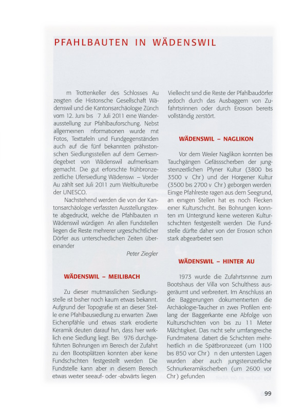 Historische Gesellschaft Wädenswil und die Kantonarchäologie Zürich vom 8. Juni bis 17. Juli 2011 eine Wanderausstellung zur Pfahlbauforschung. Nebst allgemeinen Informationen wurde mit Fotos, Texttafeln und Fundgegenständen auch auf die fünf bekannten prähistorischen Siedlungsstellen auf dem Gemeindegebiet von Wädenswil aufmerksam gemacht. Die gut erforschte frühbronzezeitliche Ufersiedlung Wädenswil – Vorder Au zählt seit Juli 2011 zum Weltkulturerbe der UNESCO.