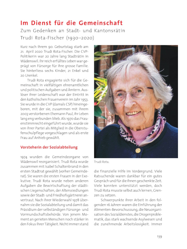 Kurz nach ihrem 90. Geburtstag starb am 21. April 2020 Trudi Rota-Fischer. Die CVPPolitikerin war 20 Jahre lang Stadträtin in Wädenswil. Ihr reich erfülltes Leben war geprägt von Fürsorge für ihre grosse Familie. Sie hinterliess sechs Kinder, 21 Enkel und 20 Urenkel.