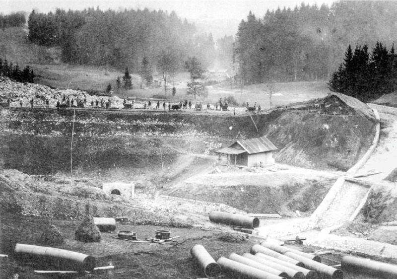 107 Vor dem fast fertigen Damm des Teufenbachweihers lagen im Frühjahr 1895 die Druckrohre bereit.