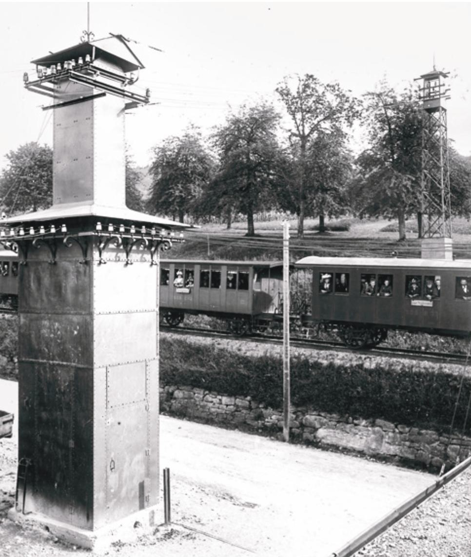 106 Das Maschinenhaus Waldhalde bei seiner Eröffnung 1895: Der Wasserstrahl aus dem Feuerwehrschlauch sollte die neue Kraft demonstrieren.