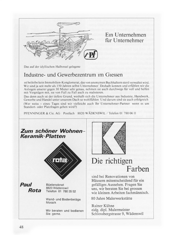 Riegelhaus am Rotweg auf, und bis zur hinteren Fuhr sah man nichts als Wiesen und hie und da ein Stück Reben. Schaute man zwischen vorderer und hinterer Fuhr vom Bänklein beim Hause Schellhaas – später baute dort Herr Wellinger sein Haus – auf Wädenswil hinunter, hatte man das Gefühl, die neuerstellten Häuser im Neudorf stünden weit ausserhalb des Dorfes. Über einer grossen Wiese – auf der 1907/09 das
