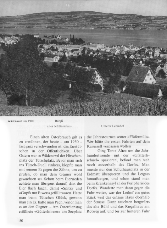 Wie freute man sich früher auf Festtage, beispielsweise auf Ostern! Bei schönem Wetter blieb niemand zuhause. Durften Kinder gar mit ihren Eltern Dampfschiff oder Eisenbahn fahren, waren sie überglücklich. Aber auch ein Spaziergang zählte – vor allem wegen des Nussgipfels und der Limonade, die man unterwegs im Wirtshaus genoss – zu den Jugendfreuden. Einen alten Osterbrauch gilt es zu erwähnen, der heute – um 1950 – fast ganz verschwunden ist: das Eiertütschen in der Öffentlichkeit. Über Ostern war in Wädenswil der