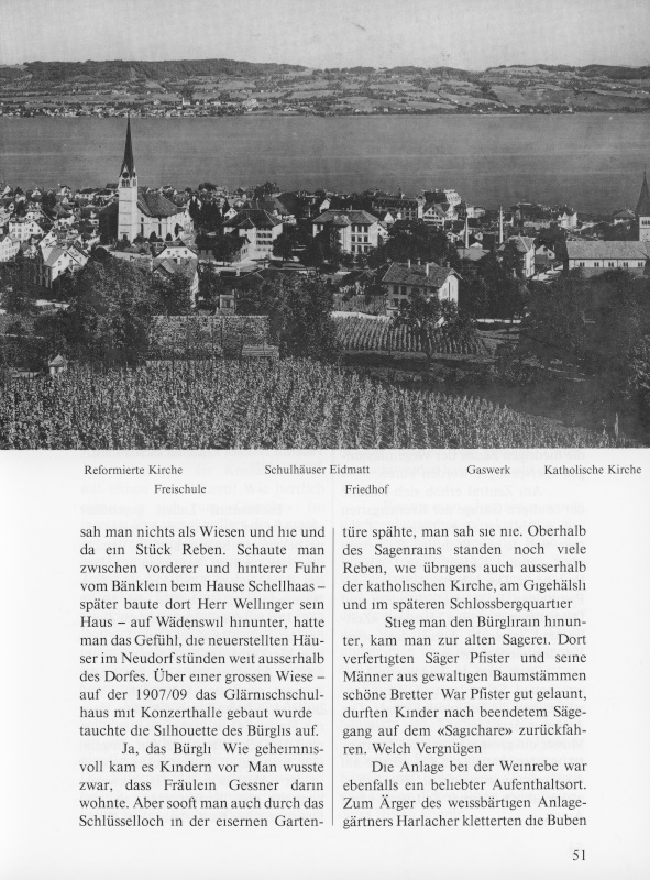 Ja, das Bürgli! Wie geheimnisvoll kam es Kindern vor. Man wusste zwar, das Fräulein Gessner darin wohnte. Aber sooft man auch durch das Schlüsselloch in der eisernen Gartentüre spähte, man sah sie nie. Oberhalb des Sagenrains standen noch viele Reben, wie übrigens auch ausserhalb der katholischen Kirche, am Gigehälsli und im späteren Schlossbergquartier.