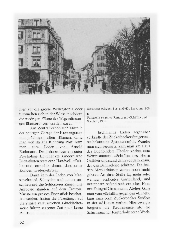 Am Zentral erhob sich anstelle der heutigen Garage der Kronengarten mit prächtigen alten Bäumen. Ging man von da aus Richtung Post, kam man zum Laden von Arnold Eschmann. Der Inhaber war ein guter Psychologe. Er schenkte Kindern und Dienstboten stets eine Handvoll «Zeltli» und erreichte damit, dass seine Kunden wiederkehrten.