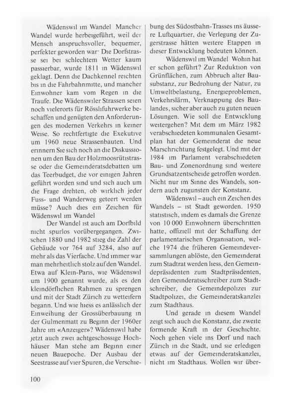 Wädenswil im Wandel! Wohin hat er schon geführt? Zur Reduktion von Grünflächen, zum Abbruch alter Bausubstanz, zur Bedrohung der Natur, zu Umweltbelastung, Energieproblemen, Verkehrslärm, Verknappung des Baulandes; sicher aber auch zu guten neuen Lösungen. Wie soll die Entwicklung weitergehen? Mit dem im März 1982 verabschiedeten kommunalen Gesamtplan hat der Gemeinderat die neue Marschrichtung festgelegt. Und mit der 1984 im Parlament verabschiedeten Bau- und Zonenordnung sind weitere Grundsatzentscheide getroffen worden. Nicht nur im Sinne des Wandels, sondern auch zugunsten der Konstanz.