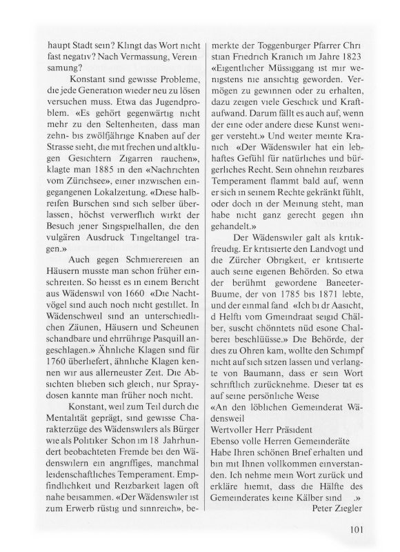 Und gerade in diesem Wandel zeigt sich auch die Konstanz, die zweite formende Kraft in der Geschichte. Noch gehen viele ins Dorf und nach Zürich in die Stadt, und sie erledigen etwas auf der Gemeinderatskanzlei, nicht im Stadthaus. Wollen wir überhaupt Stadt sein? Klingt das Wort nicht fast negativ? Nach Vermassung, Vereinsamung?