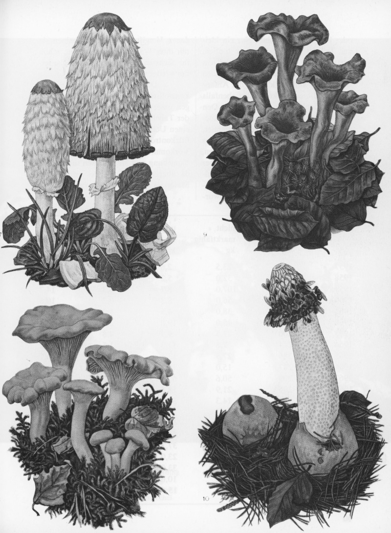 7 Schopf-Tintling, 8 Pfifferling, 9 Totentrompete, 10 Stinkmorchel.