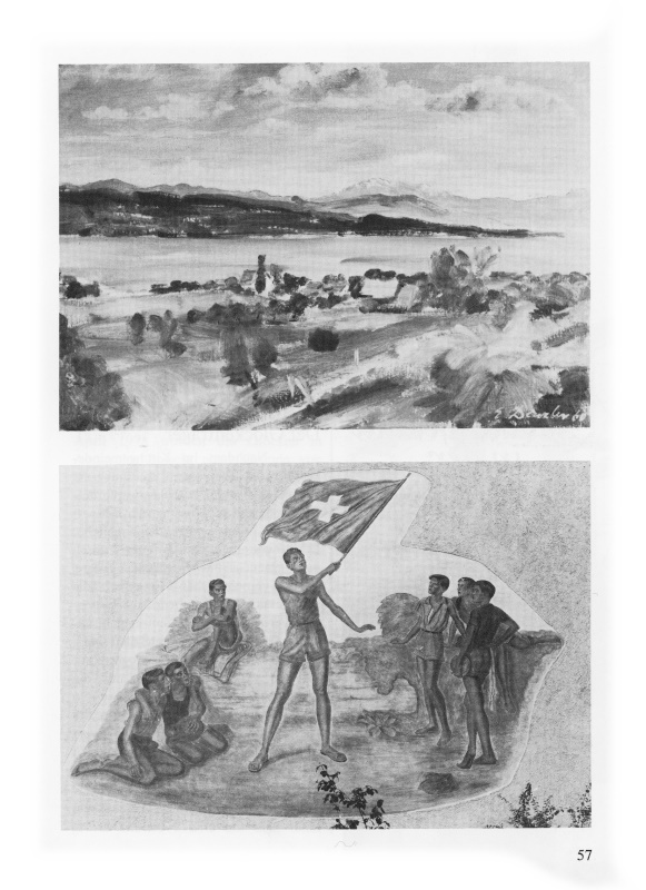 57b Ernst Denzler, Fahnenschwinger Wandbild an der Turnhalle Eidmatt I, 1952.